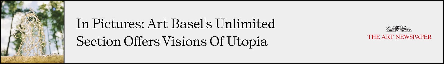 In addition to the stories below, I loved this fly-through reel of the Unlimited show floor from the Art Basel handle and quick-hit commentary from art-world influencer Jeff Magid.