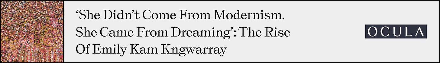It’s been great seeing all the press for Aboriginal artist Emily Kam Kngwarray amidst her with concurrent exhibitions at Tate Modern and Pace Gallery. This Ocula piece honors her legacy within and beyond the context of the art world.