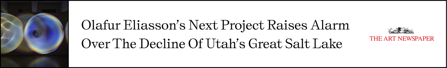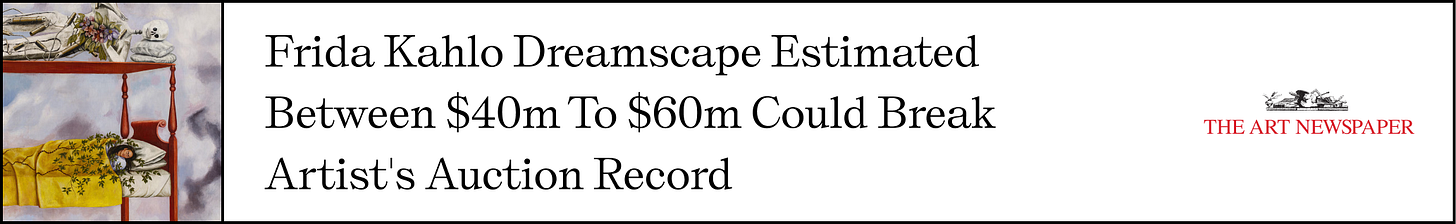 This week I wrote from the road again, thinking about how bodies move through places and feelings through travel. The works that stood out last week centered around figuration, abstraction, and installation, each asking how form meets feeling, how identity shifts with context, and how place imprints itself on us. Plus, some big pieces going to auction, and some art-inspired fun facts.