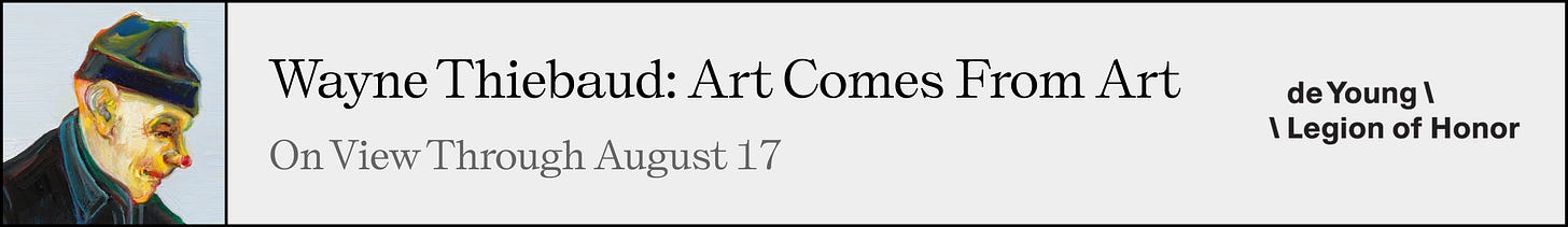 I’m not at all equipped to cover the whole world of sweltering summer art shows, but wanted to shout out one that holds a special place in my heart—I’m from Sacramento, where Wayne Thiebaud made his home, and I spent a decade living in San Francisco. But even for the impartial viewer, the care and curation behind this show are unmistakably exceptional: